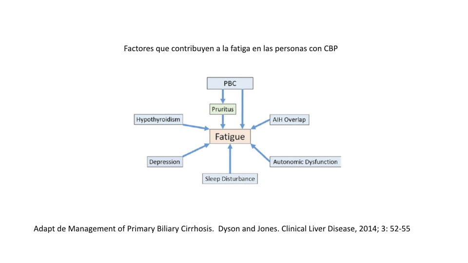 La causa de la fatiga en la CBP es desconocida y puede ser muy debilitante. Actualmente no hay tratamientos farmacológicos aceptados para la fatiga, aunque hay investigaciones en curso. Dado que la fatiga es muy común e inespecífica, es importante descartar otras causas de fatiga. La fatiga en la CBP no se relaciona con la gravedad de la enfermedad hepática ni con su pronóstico.
