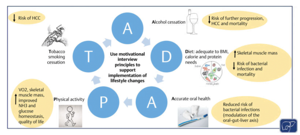La evidencia acumulada indica que la desnutrición, la obesidad, el estilo de vida sedentario, el alcoholismo y el tabaquismo, y la mala higiene oral pueden aumentar el riesgo de progresión de la enfermedad, y algunos de ellos se relacionan con un mayor riesgo de carcinoma hepatocelular. Es importante destacar que los factores conectados con el estilo de vida en gran medida pueden ser modificados, por lo que representan un enfoque atractivo para agregar a la terapia etiológica y farmacológica existentes en pacientes con cirrosis. No obstante, el estilo de vida a menudo se descuida en esta población.