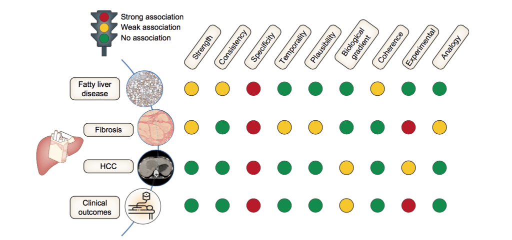 Figura 2. La magnitud de la asociación entre el tabaquismo y la enfermedad hepática según cada criterio de relación causal se representa como un sistema de semáforos. La asociación fue evaluada críticamente para la enfermedad del hígado graso, la fibrosis avanzada, el carcinoma hepatocelular (HCC) y los resultados clínicos. Los círculos verdes representan una asociación fuerte, los círculos amarillos representan una asociación débil y los círculos rojos representan la ausencia de asociación.