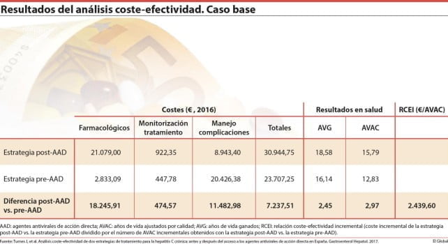 Los datos que presenta el informe (ver tabla) sobre el análisis de coste-efectividad de las dos estrategias -pre y post AAD- para abordar la hepatitis C señala que el AVAC con los nuevos tratamientos alcanza la cifra de 15,79 años por los 12,83 que se obtenían con anterioridad. Además, cabe señalar que el estudio sólo considera las dos primeras nuevas moléculas aprobadas por el Ministerio, simeprevir y sofosvubir, para calcular el precio de los tratamientos farmacólógicos. Esta aclaración es relevante porque si se analizan la evolución de costes que han tenido los tratamientos se sabe que hoy, con otras moléculas aprobadas con posterioridad, el coste farmacológico es inferior. “En los 50 años de simulación de la historia natural de la hepatitis C, la estrategia post-AAD resultó ser más efectiva que la pre-AAD, consiguiendo un incremento de 2,45 años de vida ganados y 2,97 AVAC por paciente. El coste total promedio para conseguir estas ganancias en resultados en salud fue de 30.944 euros y 23.707 por paciente, con las estrategias post-AAD y pre-AAD, respectivamente”, afirman en el informe los expertos.